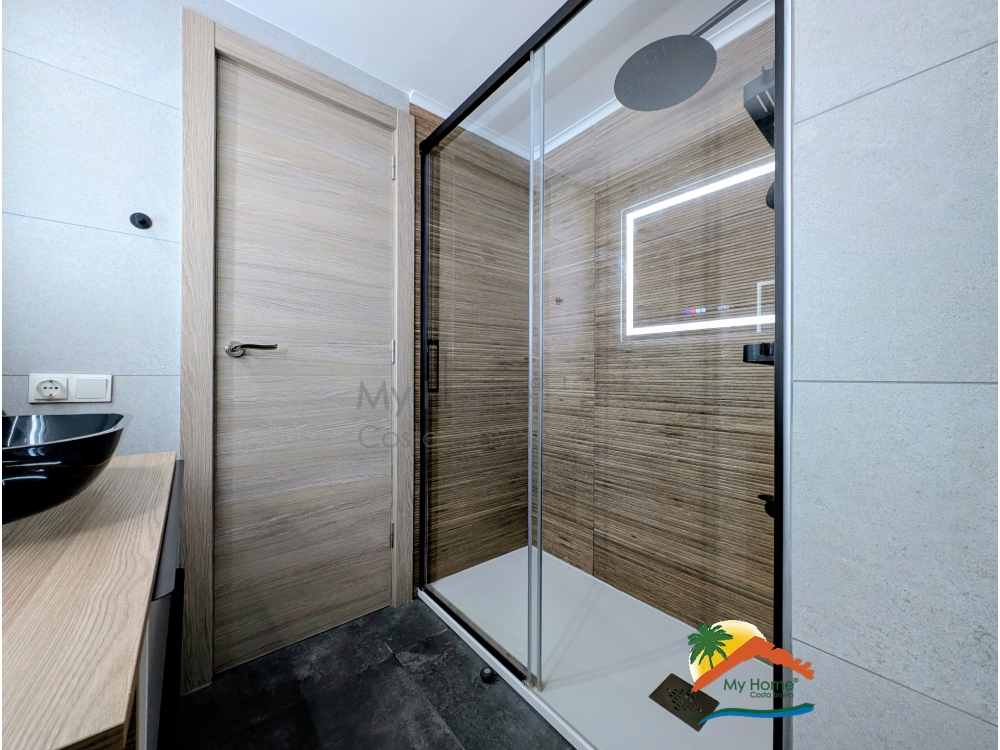 Die Immobilie bietet 93 m² Wohnfläche mit funktionaler Raumaufteilung: 2 Doppelzimmer mit Einbauschränken und Zugang zur Terrasse, 2 Badezimmer mit Dusche, ein helles Wohn-Esszimmer sowie eine vollständig renovierte, separate Küche.