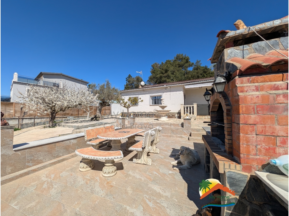 Outside, the house features a pool area, a covered barbecue area next to the pool, a bathroom with a shower near the pool, a second barbecue area at the level of the house, and a space that was previously used as a vegetable garden.